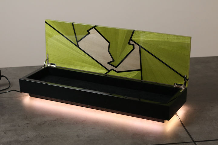 Lacquered green marquetry veneer, birchwood and MDF, high-quality brass hinges, 12v LED lights, transformer.